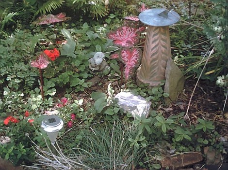 I’m like a little animal—the first good spring day I have to hang things on the clothes line and get out and dig in my dirt. I’m getting a little old to do much gardening, cos it’s a lot of work. But I plant some veggies and a few flowers, and have some perennials that make pretty flowers. Also some caladiums, which are beautiful all summer, and a few geraniums for color. Here’s an area with a sun-dial my father made.