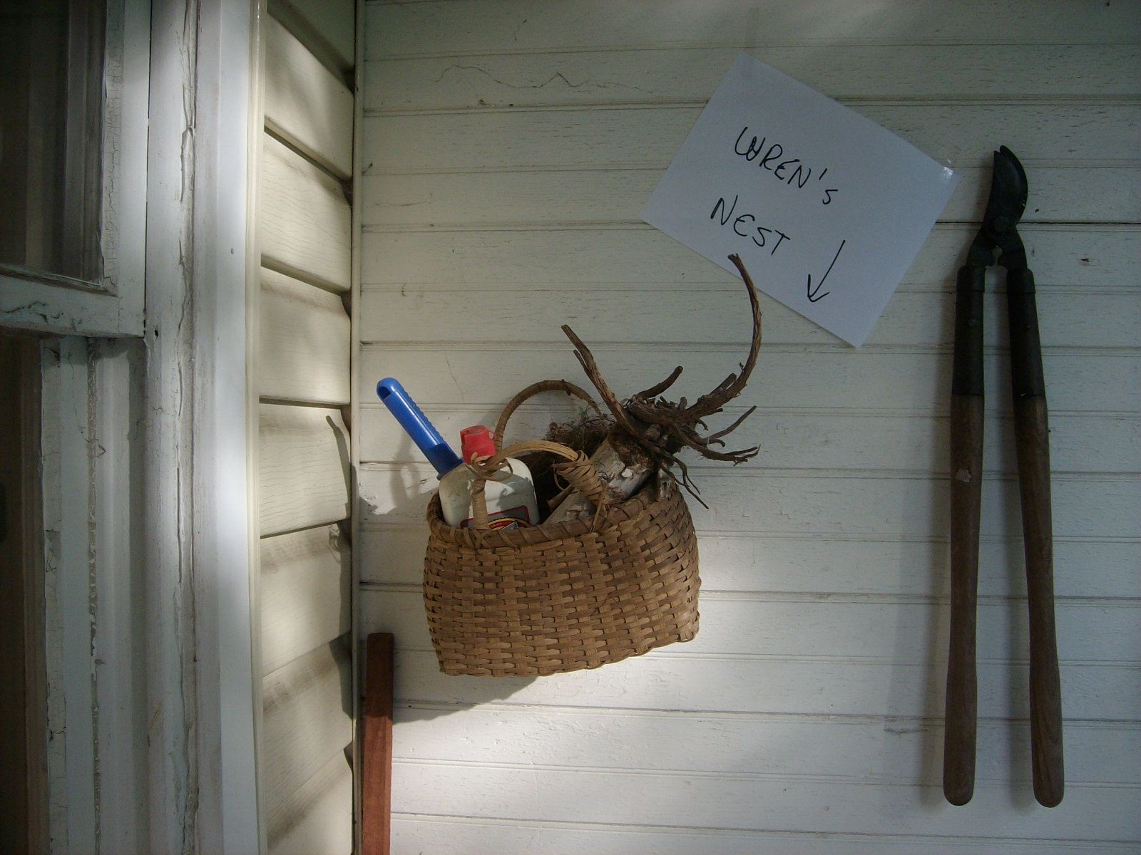 So this year I can’t start a charcoal fire unless I buy more starter, and I have another trowel to use, cos I sure won’t do anything to disturb this nest or this relationship with these birds. Just in case any visitor who comes here would do anything to disturb that basket, I hung up a sign that says Wren’s Nest, with an arrow!