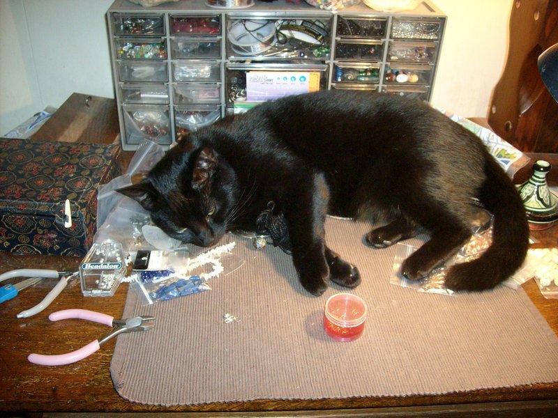 First she was a kitten. She liked to lay on my work table while I made jewelry. It was a big table, she was a small cat. In this picture, she had gotten a little bigger.