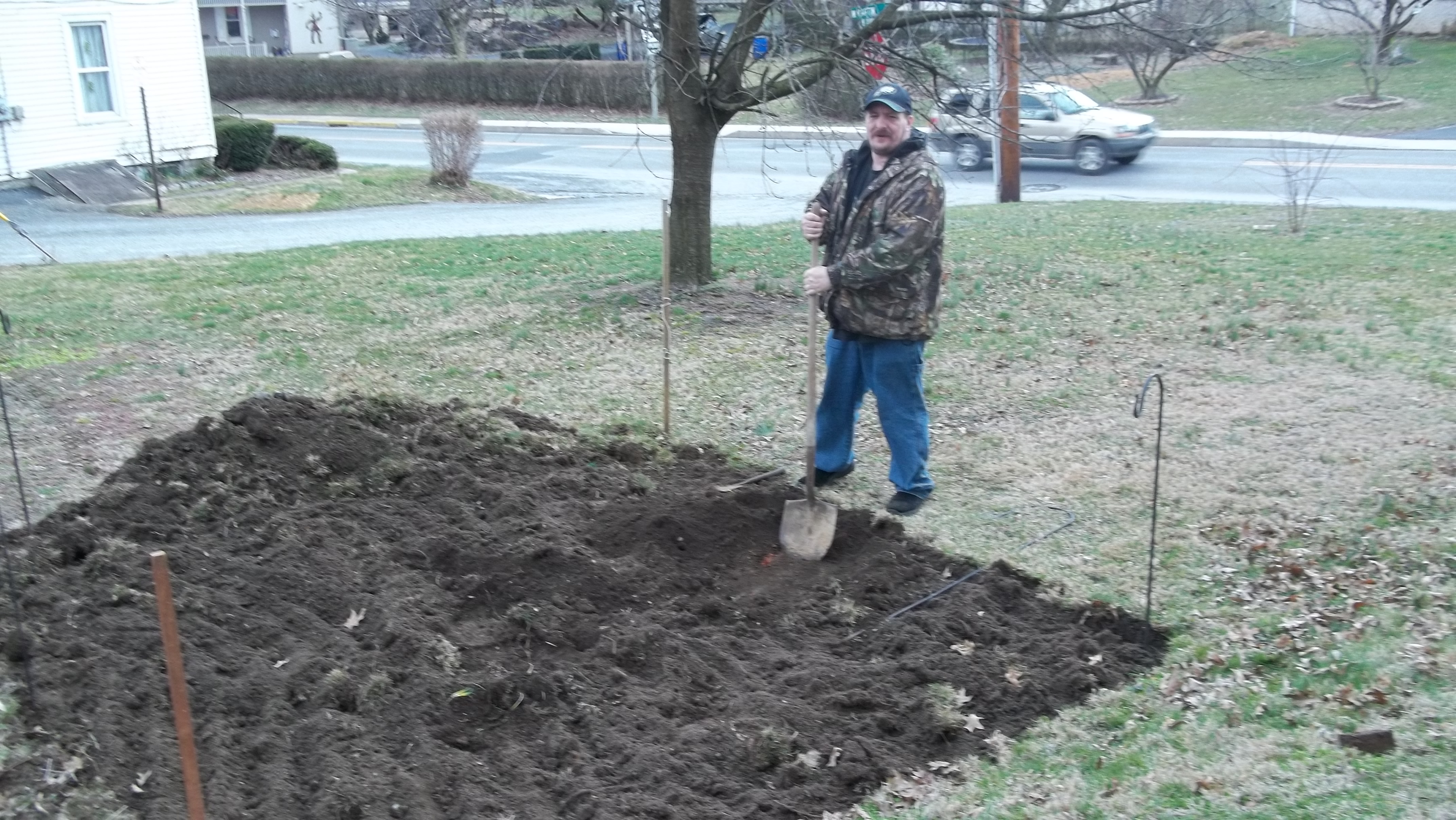 Wait, something is down in there…..hard, pretty flat……….what? My property sits in a high limestone area, but not in the immediate area where this plot had been dug. But, there was an old house on the lot till about 1936 or so. It was torn down and it’s cellar was filled with junk fill. So, here’s my son, and me later, digging up bricks and stones that are down there, to be sure the roots can go on down. We’re good for a foot, and most veggie plants don’t need more than that. I’m not planting any potatoes, and that’s a good thing! Collards, lentils, Romaine, cabbage, all those will be ok with a foot to sink roots before they hit bricks.