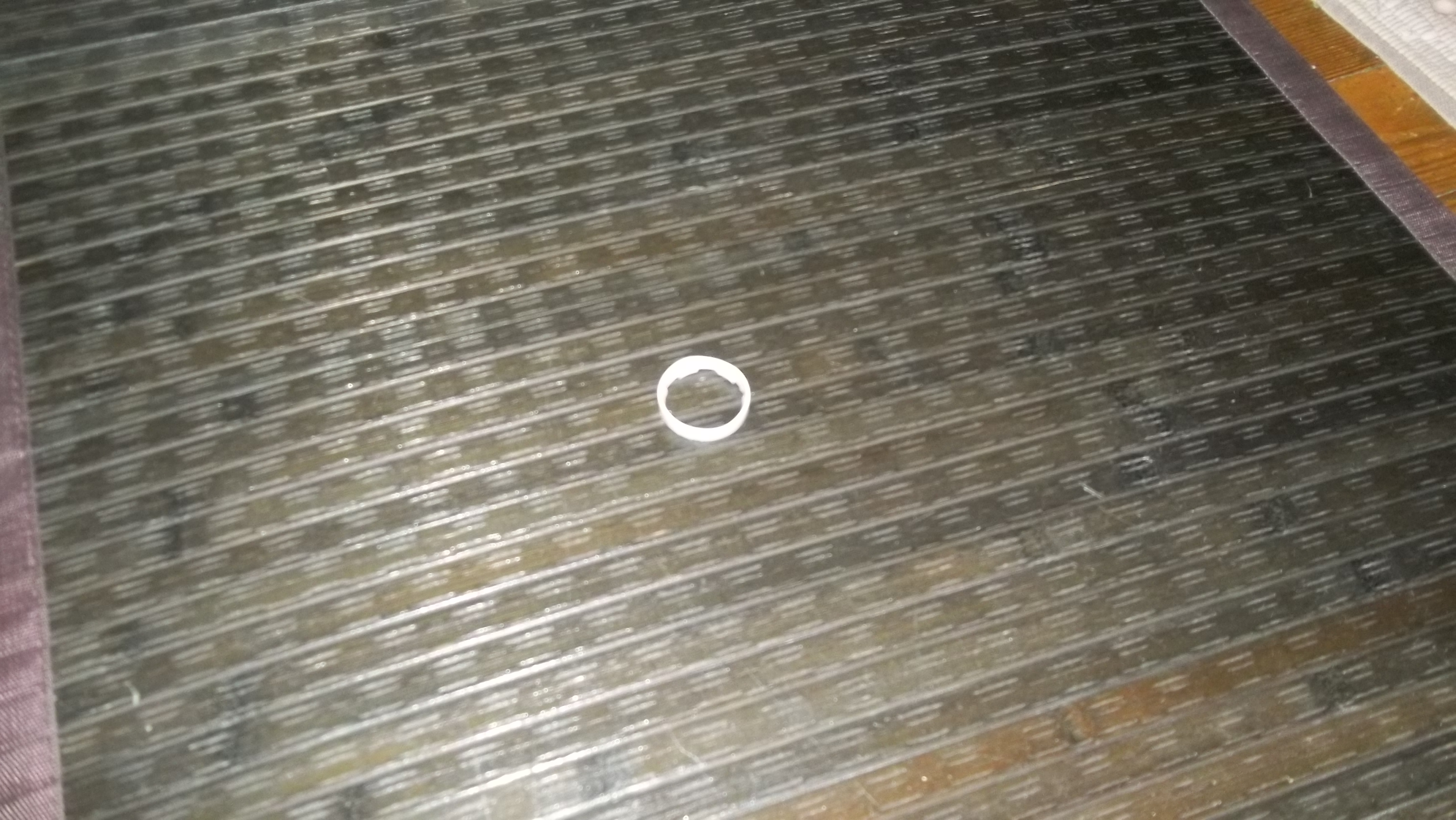 We play a game called This One. Let’s get This One, here’s This One, etc. What This One is, is a ring off a milk jug. When you screw the cap off, the ring that is left on the bottle can be removed. I throw This One across the kitchen floor, and back into the next room, and she runs and gets This One and scoots it across the smooth floor. She gets quite worked up when we play This One. This One often goes under the edges of throw rugs in the kitchen, and she runs and slides the whole rug a ways trying to get This One out from under the rug.