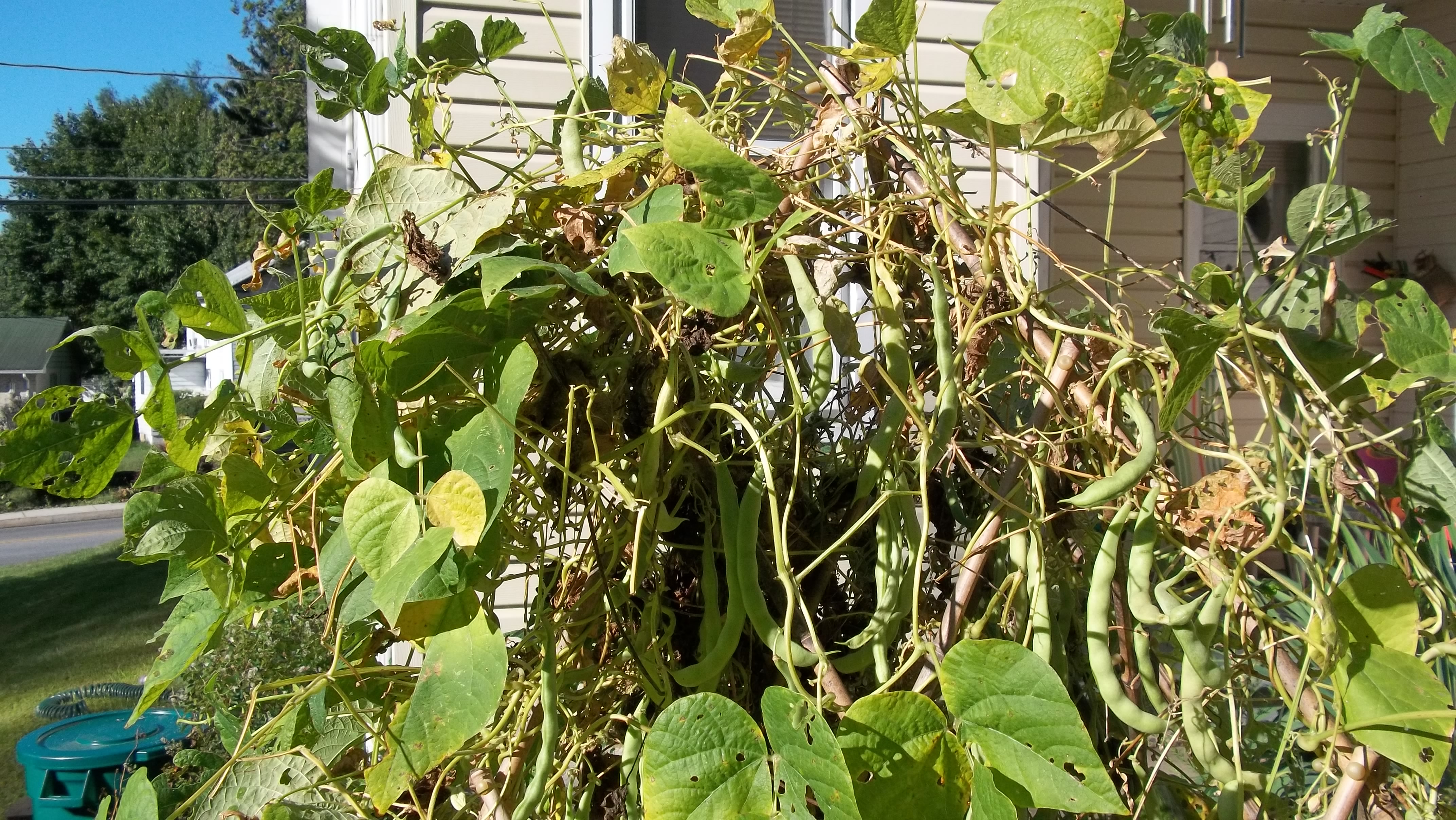 The green beans are done and have stopped flowering maybe 2 weeks ago. Once they stop flowering, the beans that are already on there seem to have a different taste and more string. So I like to stop harvesting them then, and let the rest dry. Once each pod is dry so that the beans rattle, shell them out and you have really good soup beans. Collect them as soon as each pod is dry, cos the pod will eventually crack open (to spread the seeds) and you’ll lose the beans. If you learn how to listen to plants, they will tell you their secrets. You don’t do that listening with your ears; you do it with the part of you that wants to know nature.