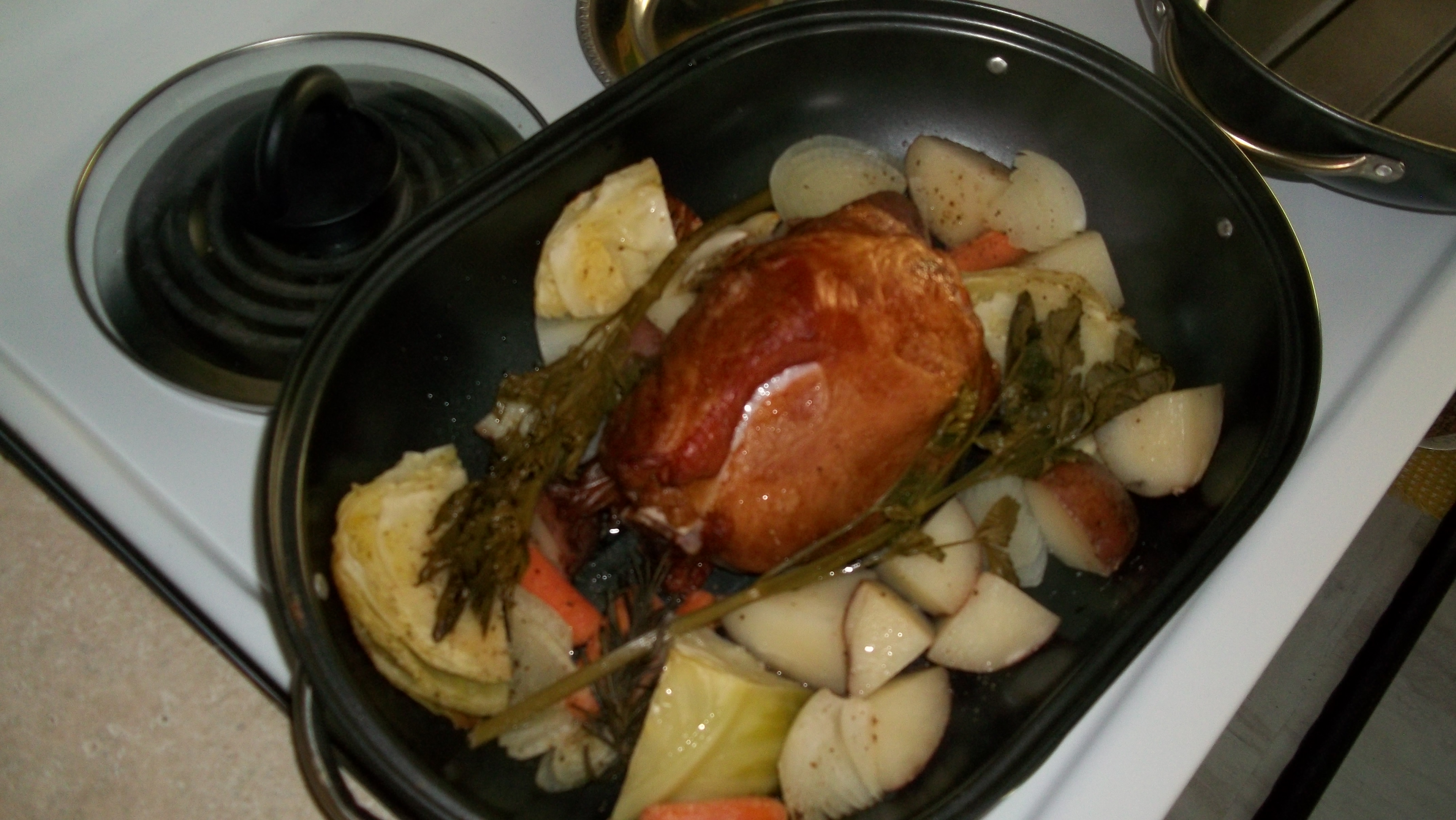 This looked so good that I thought I’d write a blog about the concept.  Took a nice sized ham hock, potatoes, cabbage, an onion cut up, and some carrots and arranged them in the pan.  Added two stalks of lovage across the top for flavor. (Here’s a blog about lovage, cos most won’t know what it is:  https://sarasinart.net/2013/04/25/lovage/ )