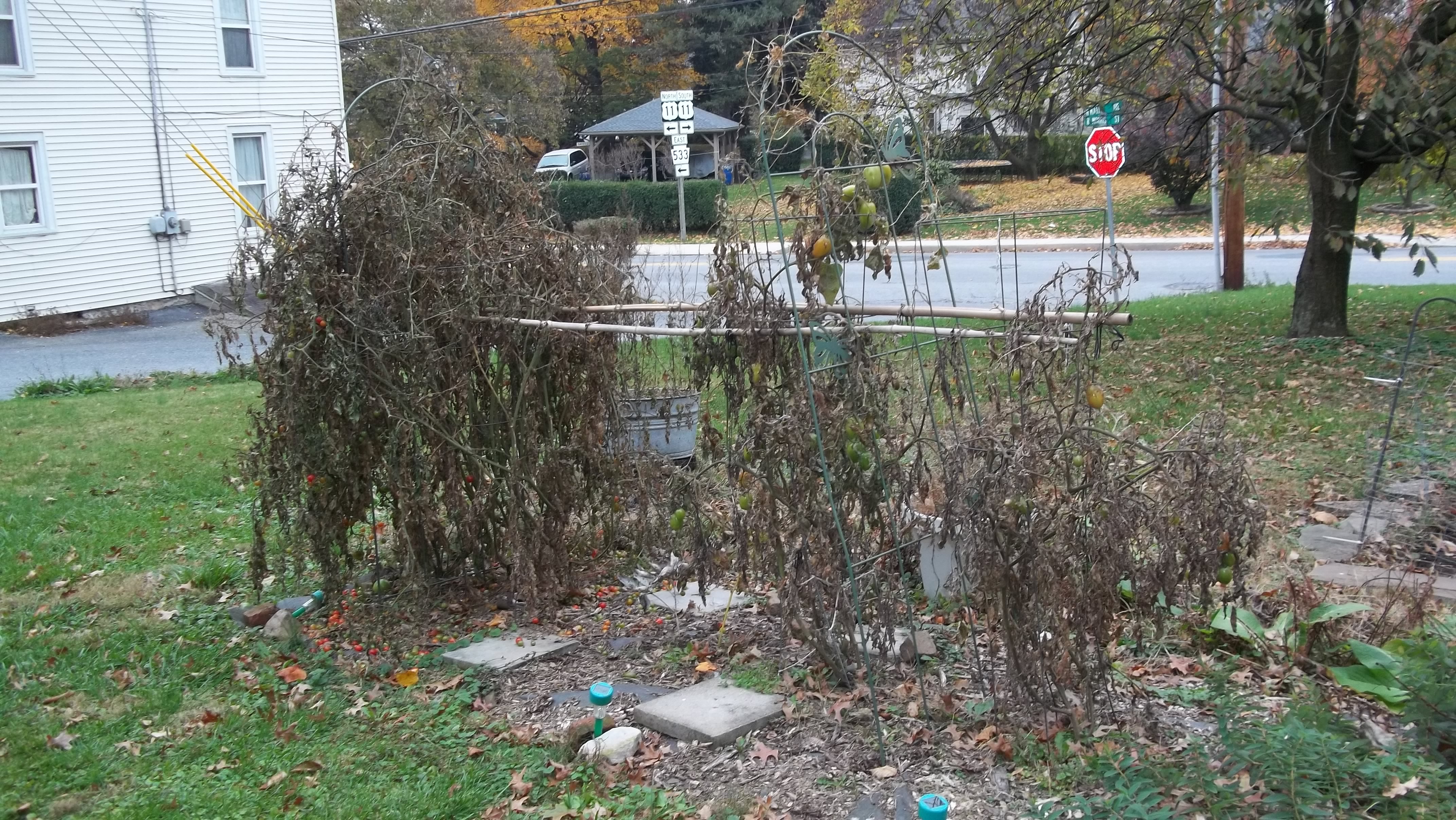 Time to tear down the tomato plants.  Yea.  The frost has cut everything off now, the cherry tree has lost all its leaves, annual things are done and perennial things have gone to rest.  There’s work to do out in the yard cleaning things up.
