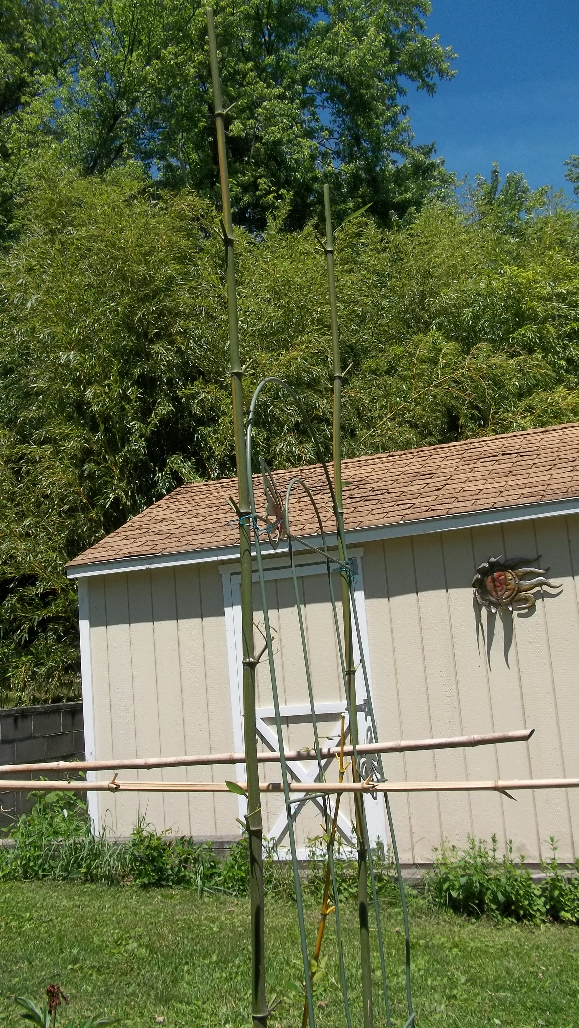 Lima beans are supposed to get 10′ tall, and there are only a few plants and they have a 6′ trellis, but I cut some bamboo and lashed the poles to the trellis, and the trellis now has a name. It’s called Encouragement, lol.