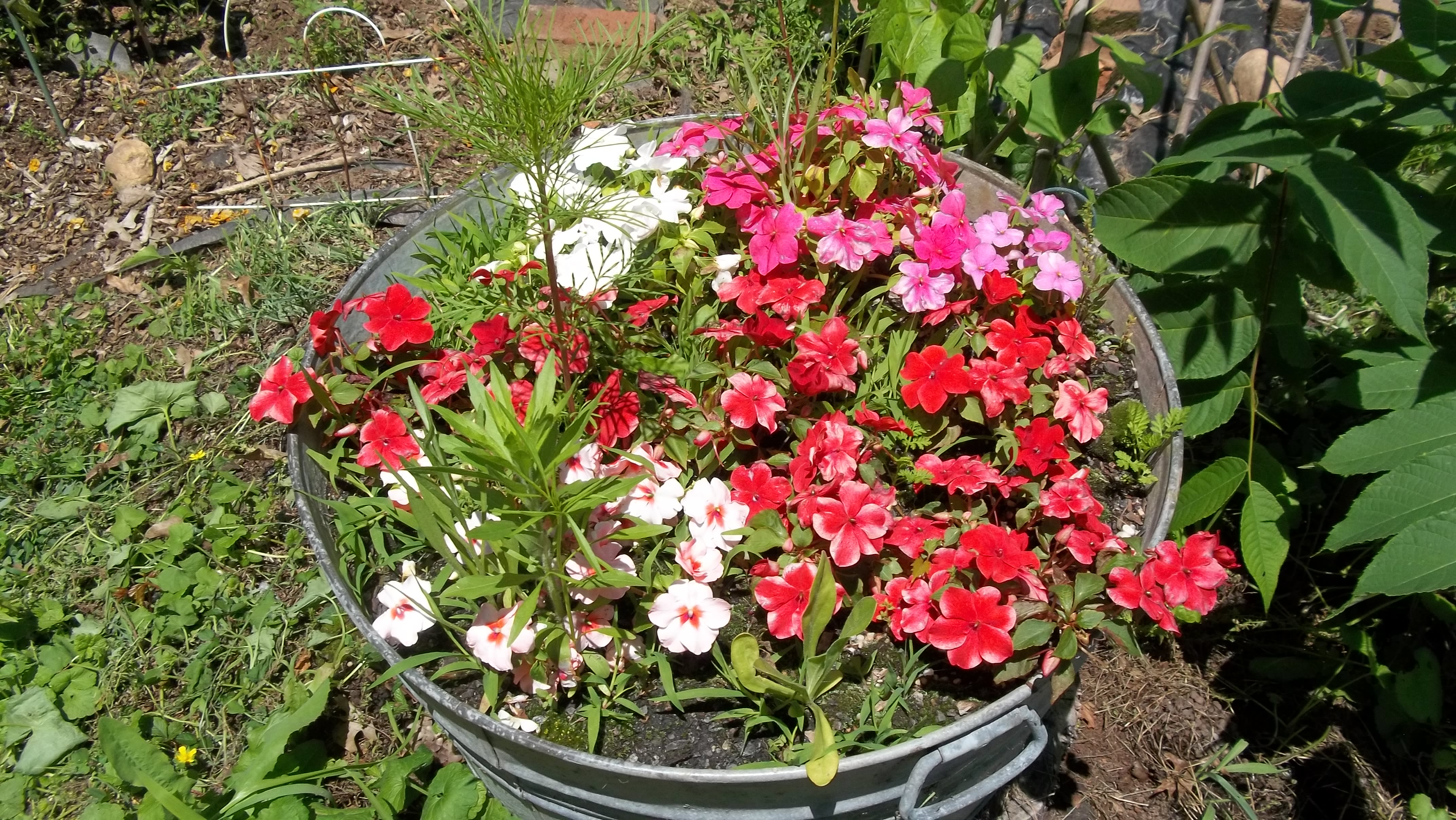 You can’t eat everything, and some things are just pretty. Like a washtub full of impatiens and a few wild flowers among them.