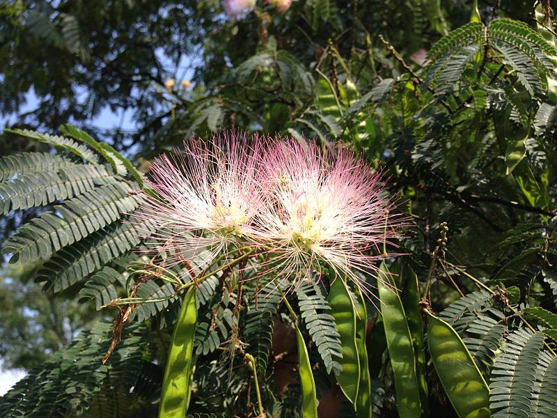 Mimosa is also called Persian silk, and gets flowers that look like paintbrushes, and are well loved by hummingbirds. The leaves close up on each frond each night, and it’s a really pretty tree. Below is a picture I took from Wikipedia, and there is much more information there about these trees. http://en.wikipedia.org/wiki/Albizia_julibrissin