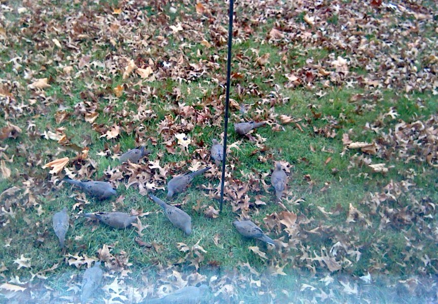 Before the first snow, which came today, the doves knew they needed to get as much food as they could find.  There are often at least a dozen below the bird feeder, where I always put some seeds on the ground.