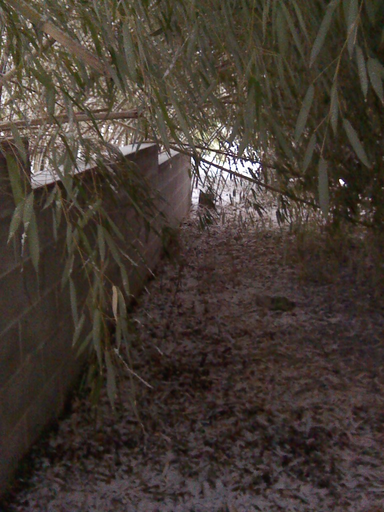 A retaining wall goes around the garage.  This is behind the garage.  Beside the garage, looking out toward where my son parks his truck, it looks like this now, with the bamboo laid down with snow, like a tunnel.