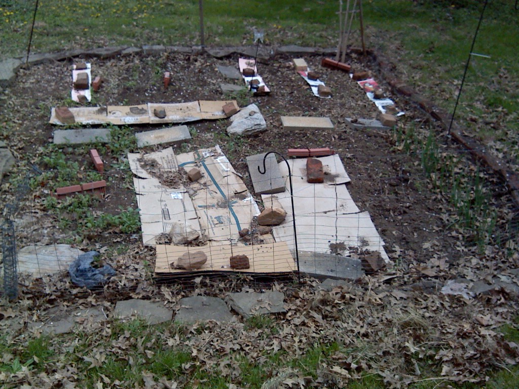 The area in the rabbit fence is laid up and ready to grow things:  collards, cabbage, spinach, sorrel and other things that the many bunnies around here consider  to be a Rabbit Buffet.  Onions are already up and a second group is planted for a scattered harvest.  Later I’ll lift some cardboard on the near side to plant some cucumbers.  Black eyed peas will grow in there too, since it’s the area farthest from the house and garage. Black eyed peas attract wasps and yellow jackets, and Dylan is allergic to the stings.
