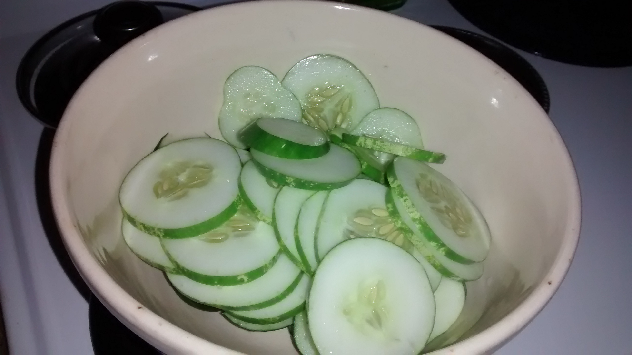 My husband’s old grandmother, the lady who taught me the small amount I know about canning, used to make a thing called freezer pickles. They weren’t canned, not even cooked, but were frozen, and always made about the same time as canning was going on, so I associate them with canning anyway. She put other vegetables in with the cucumbers and I never liked what she called freezer pickles. All summer I’ve been eating one of my favorite summer treats: cucumbers and onions. Those two veggies are sliced thin and put into a sugar/vinegar/salt solution and left sit about 24 hours to blend flavors. I like a little heat in some things, so I cut up a red chili in mine. You also add celery seed, and because I like dill and we had some growing, I’ve been adding dill to mine too. So, I had given some tomatoes and cukes to a friend who was canning a couple weeks ago, and she sent me some treats to return the favor. She sent a jar of her canned bread and butter pickles, and a frozen container of what she calls freezer pickles. I looked at that, and oh wow, it’s the same thing I’ve been eating for weeks in the summer for years, cukes and onions, and oh wow, who knew you could freeze that stuff! Maybe I’ve been under a rock and it’s a revelation to me while every other good gardener/food preserver already knew it, but now I know it too! So of course today I set out to make a batch of freezer pickles. When ours from the garden are all gone and the price of cukes goes sky high for ones that aren’t even good in the winter, I’ll pull out a container of summer treat! I used my mandolin slicer to get good even slices. That slicer was a gift from a friend and has dangerously sharp blades; so much so that he offered to get me band aids for Christmas. I promised I would not end up needing the band aids, cos honestly if I ever cut myself with this nifty tool, I’d be on my way to the ER for stitches, not just hunting a band aid. I’m very careful with my mandolin.