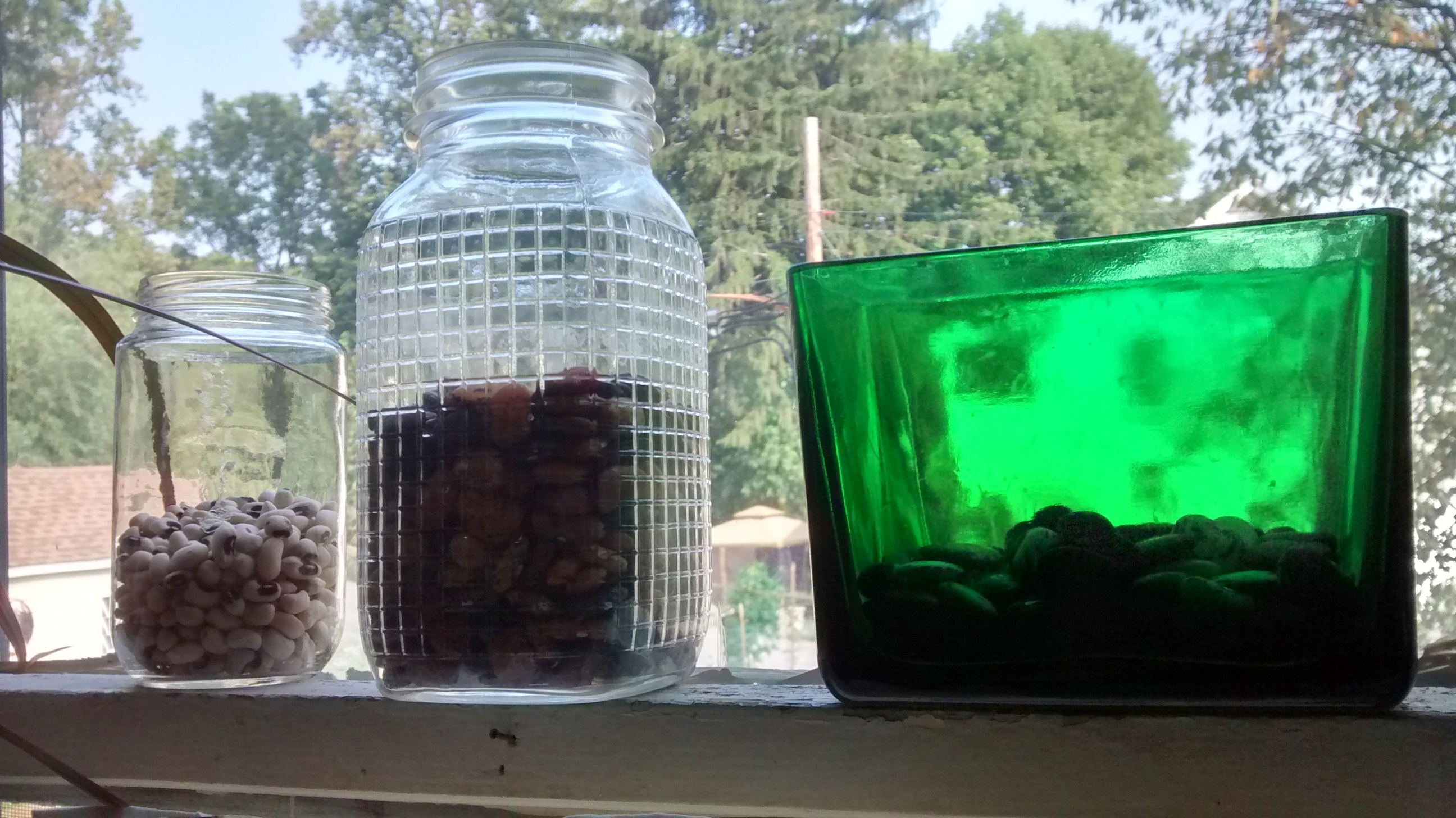 The ones that are getting dried go in glass containers on one of my sunniest window sashes to cure for a couple weeks before I pack them away. You need to make sure there’s not one bit of moisture in any of the beans before you close the containers, or mold will happen quickly and you’ve lost the whole batch.