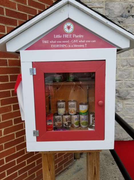 This Little Pantry is at the Lutheran church in town. People put food items in it, or hygiene items, and anybody who needs something from it can take what they need.