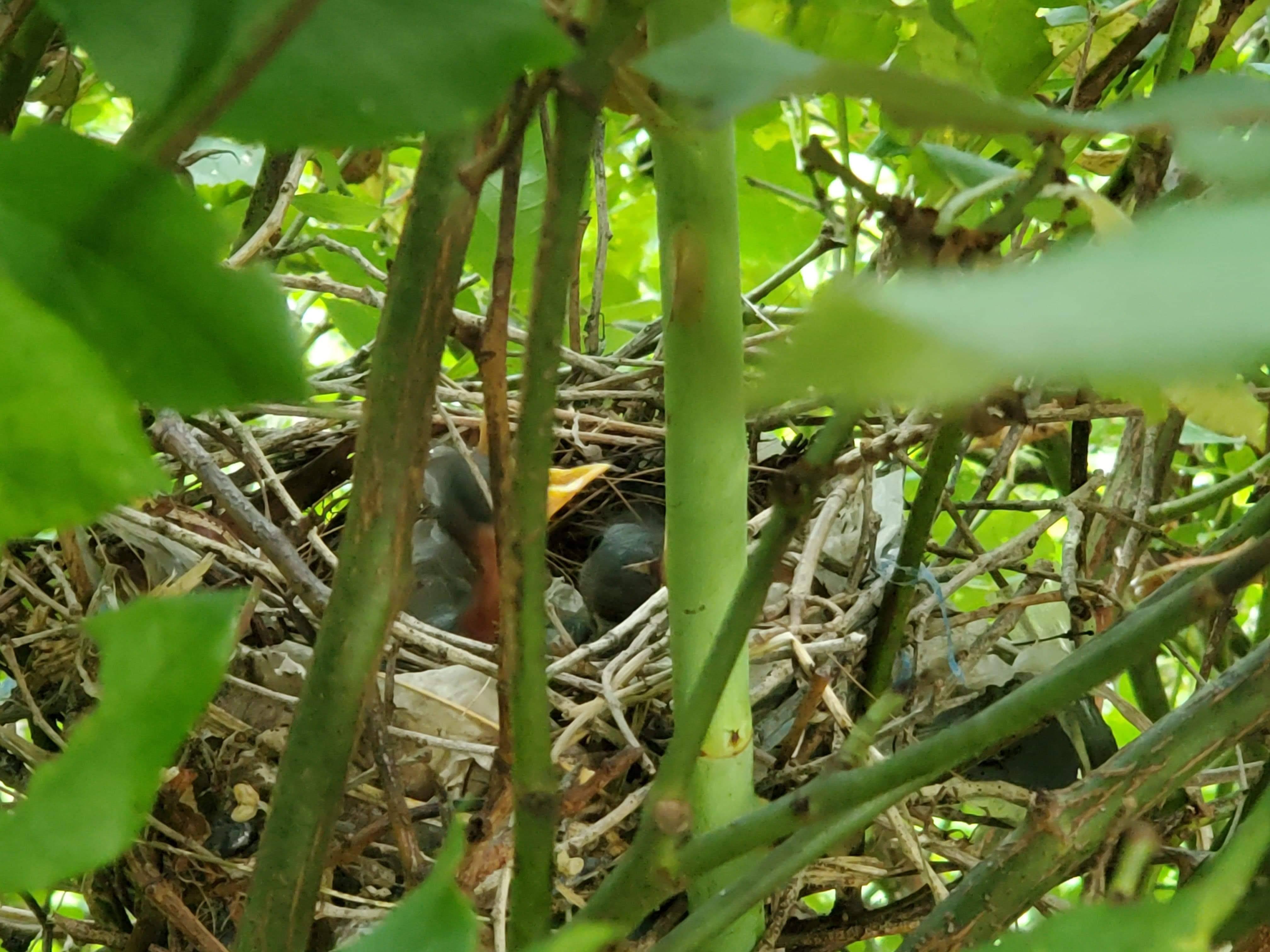 Now, they have a nest with 2 babies, in the fairly thick rose bushes right off the back porch. They don’t care that we live together here, and that’s so nice. Nature is always amazing.