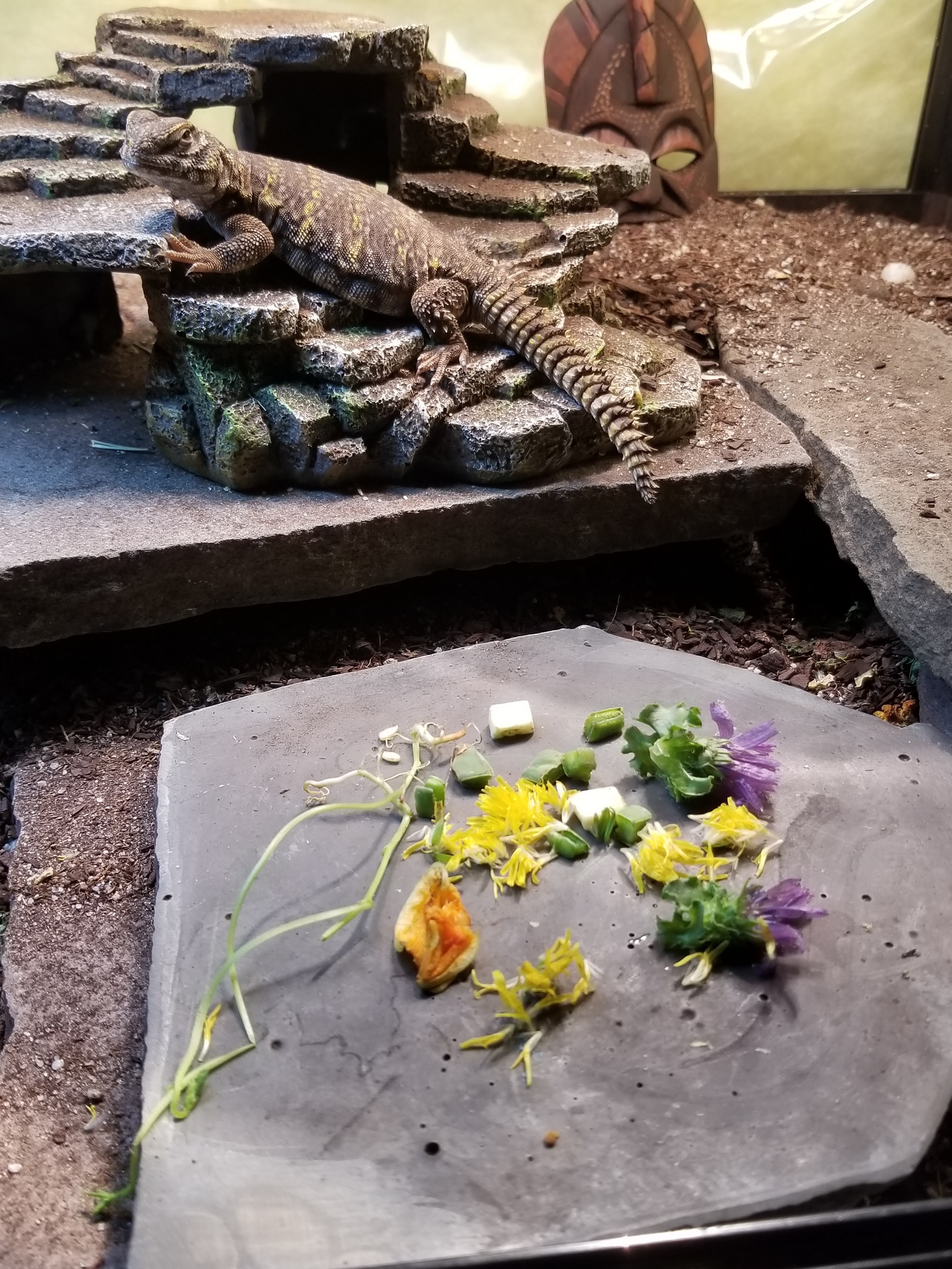 Geyri, my little uromastyx, gets in some on the gardening harvest, since I grow a few plants that have flowers that are safe for him to eat and that he likes. He also gets dandelions from the yard. He’s not so little anymore, and has just had his first hatch day birthday recently.