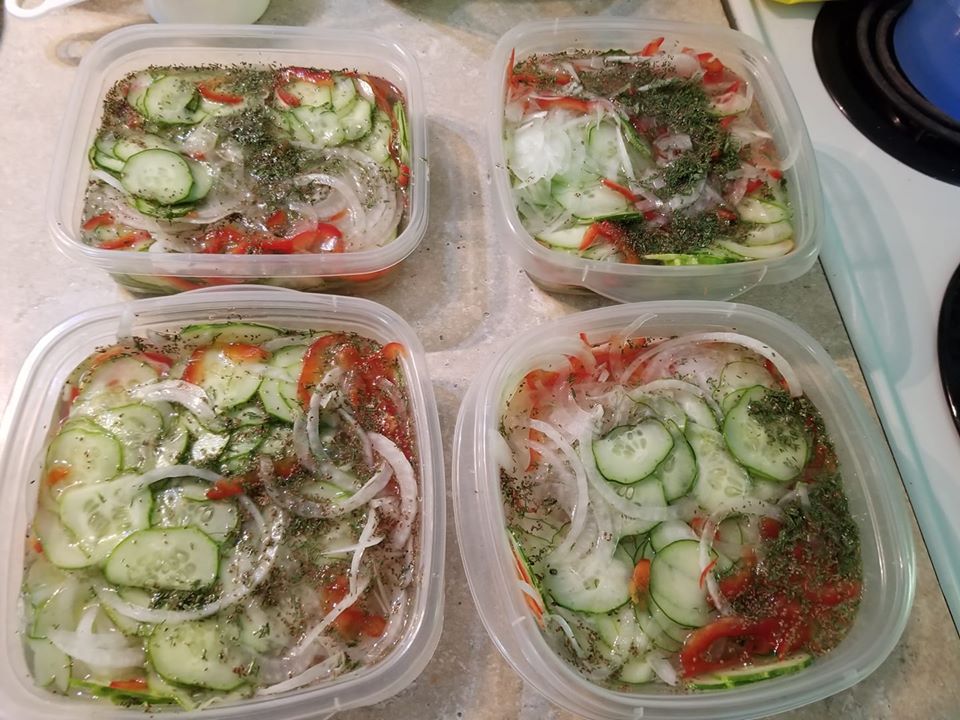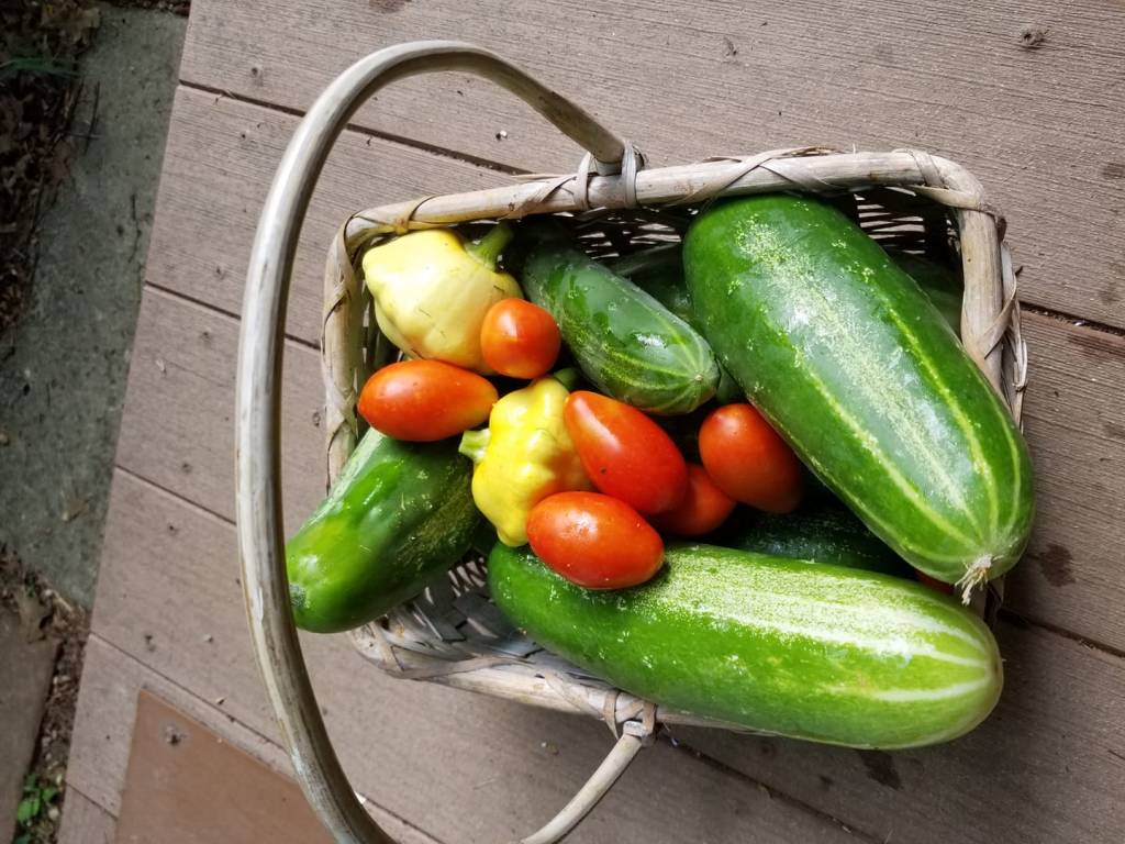 We had a really good run with cucumbers. With consistent watering, they didn’t seem to care that it was so hot. My son and DIL and I ate plenty, I got to share some, and I made a big batch of freezer pickles, a favorite of mine. We had some of them last year for Christmas dinner, and they’re such a good winter treat.