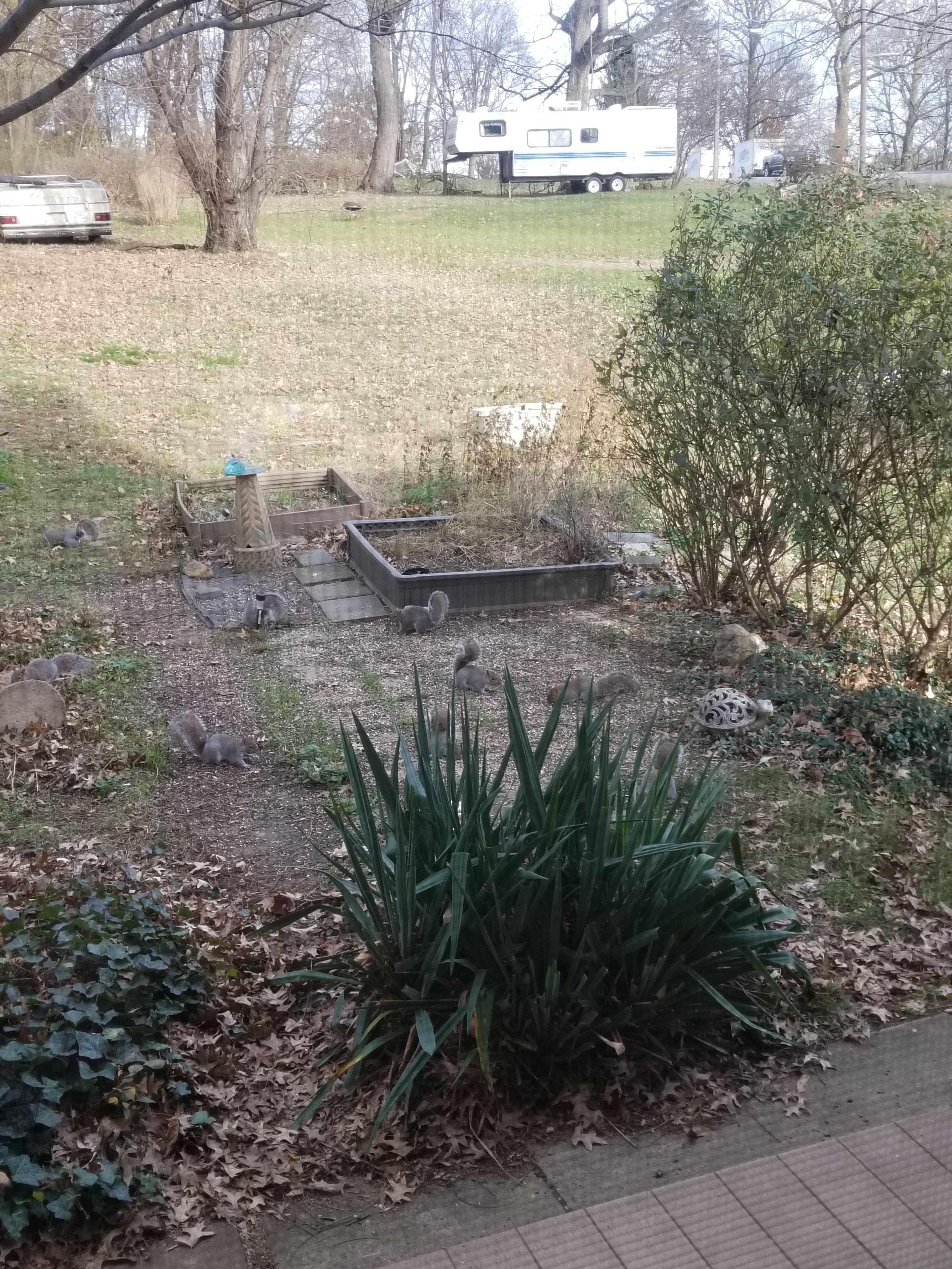 There were 10 squirrels out there at once, and one ran away. My backyard is a wildlife refuge, with food for all the birds and squirrels. 10 or so different kinds of birds eat throughout the day, and territory is always in question but everybody gets along, somehow. Squirrels rule tho, cos they are aggressive and run some of the birds away.