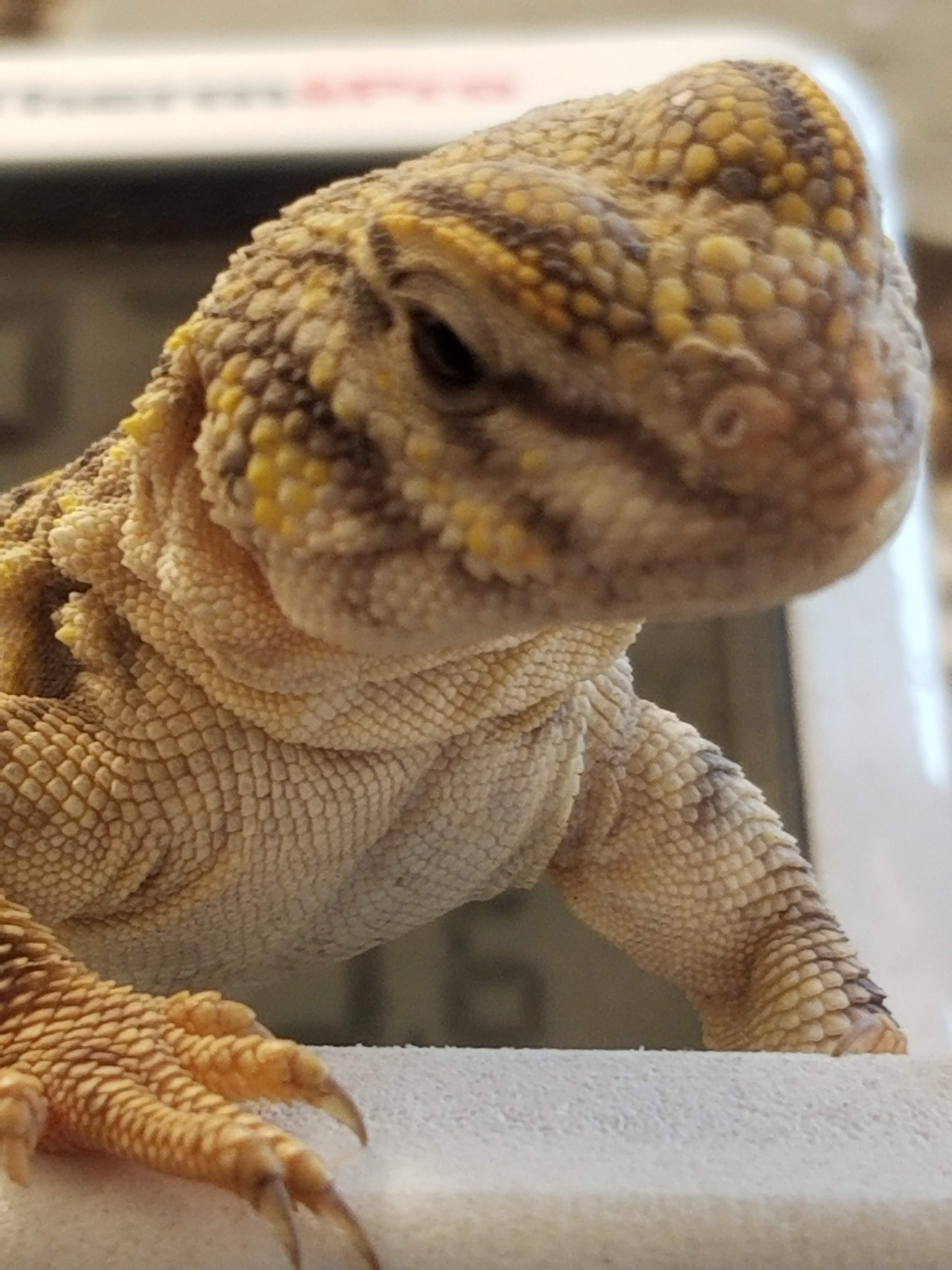 Because of the things they eat and the way they have evolved to retain moisture in their bodies, their solid waste is a nice neat little slightly moist pellet, and sometimes a little liquid, actually pee. The pee dries up within a few minutes in the heat of this arid environment, with the humidity less than 20%. The neat little pellet is dark and easy to see, and also dries out quickly. Using a tissue, I can easily pick up the little pellet and some of the substrate (sand etc) around it. So there is really no need to ever change out the whole amount of substrate. Also, because they are vegetarians, there is no smell to the solid waste. We do smell and inspect each poop, because the poop is a good indicator of overall health of the animal. Sometimes they have internal parasites, worms, but since she came from a trusted breeder and eats no insects, there is very little chance for her to ever have worms. The solid waste should smell like earth, no bad odor, and a bad odor would signify some problem like worms. So each little deposit is cleaned up, checked on and flushed, easy. What an interesting question! We Uromastyx keepers have a wonderful huge FB site with keepers from all over the world, where we discuss poop and even show pictures, so that new people know how to judge this health indicator; frequency, shape, consistency. So we discuss poop there but nobody else ever asks about poop, lol. There is a lot of science to be learned to keep one of these unusual lizards healthy and happy, and pet stores and even some vets know almost nothing, so that site is our place to learn and teach. The procedures for their waste and its disposal are entirely different from some other lizards like bearded dragons. Beardies eat bugs and the poop is, oh, it stinks and it’s a huge wet blob. Most beardie keepers keep no substrate in their enclosures, cos it would need to be changed out frequently. They usually use paper towels on the floors of their enclosures, and cleaning up is still a big deal compared to Uromastyx. Others that eat bugs are also messy poopers: tegus, monitors come to mind. Geyri is a neat pooper, lol, and easy to tend to with that. 😊