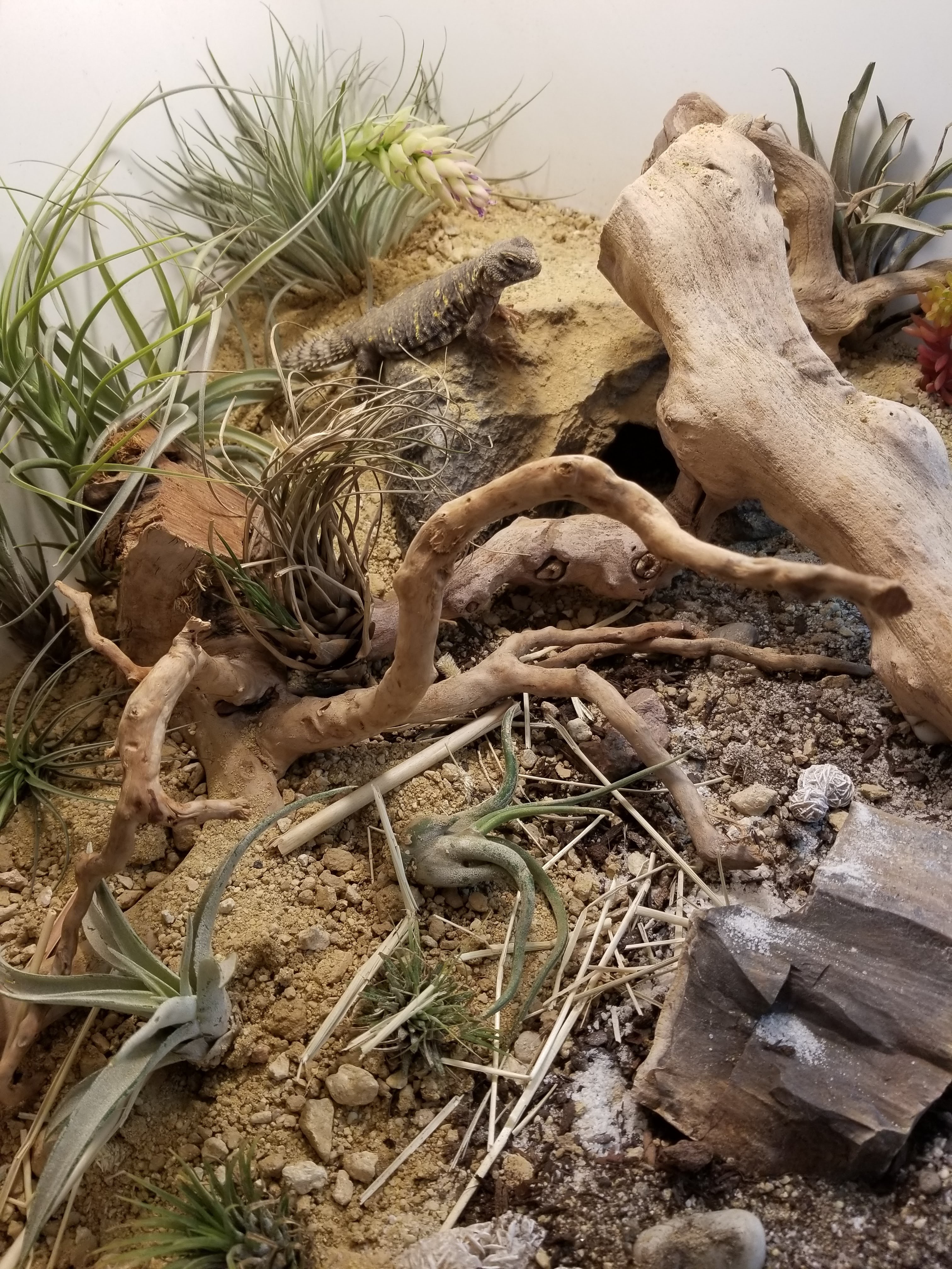 Beyond that is an oasis. There are some oases scattered thru the desert her parents came from, and her oasis is in the cool end of her house, at about 85 degrees. There is a nice small cave for her to go into in the oasis. Air plants are in the oasis, to show her there is a cooler place where some plants will grow. I take them out and soak them once a week and they do pretty well in the cool end of Geyri’s desert. I have a happy and healthy little Uromastyx with a big personality, and she makes me smile and laugh.
