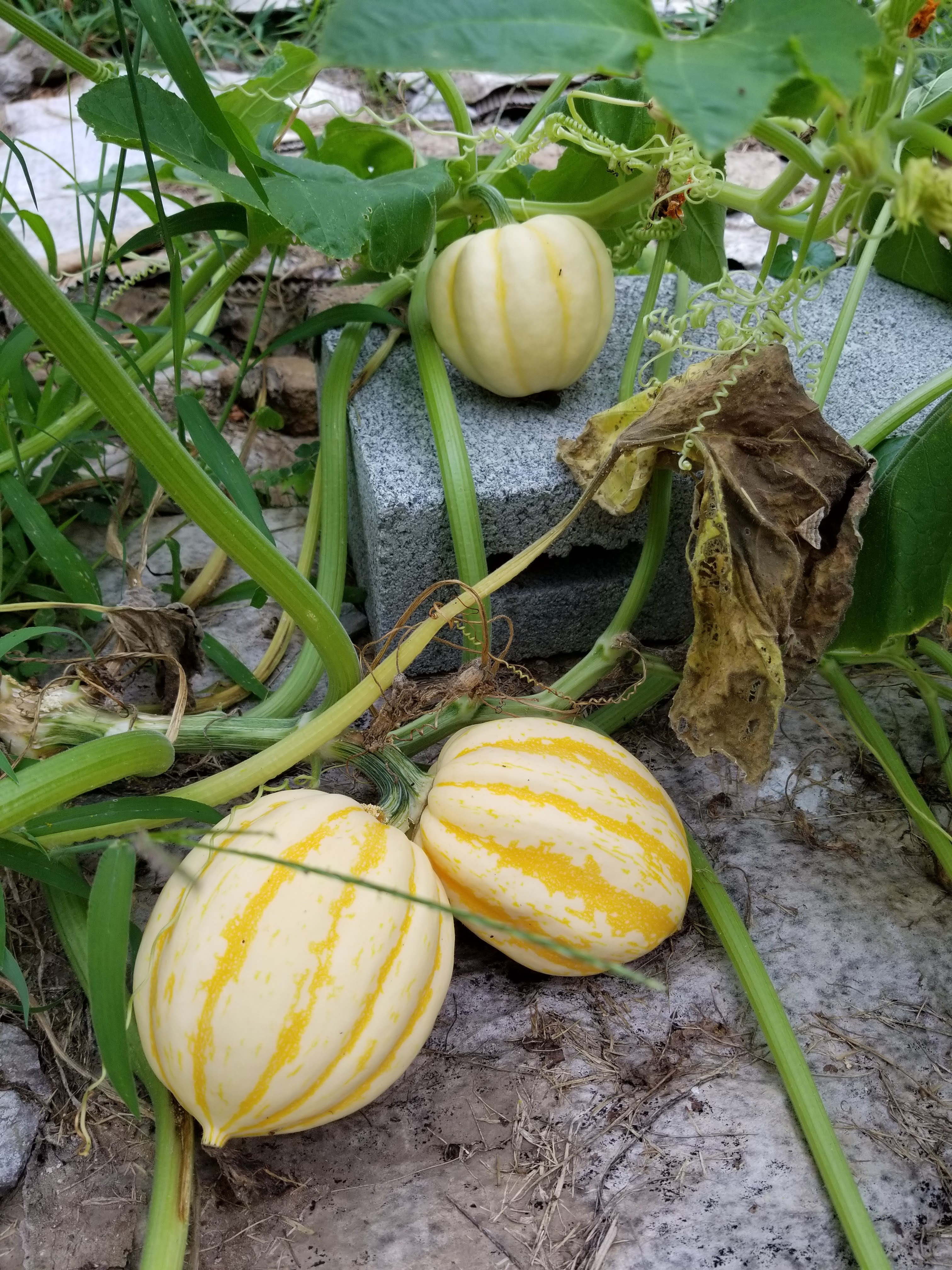 We’ve been eating summer squash called pattipans. and there are winter squash called sweet muffins developing well.