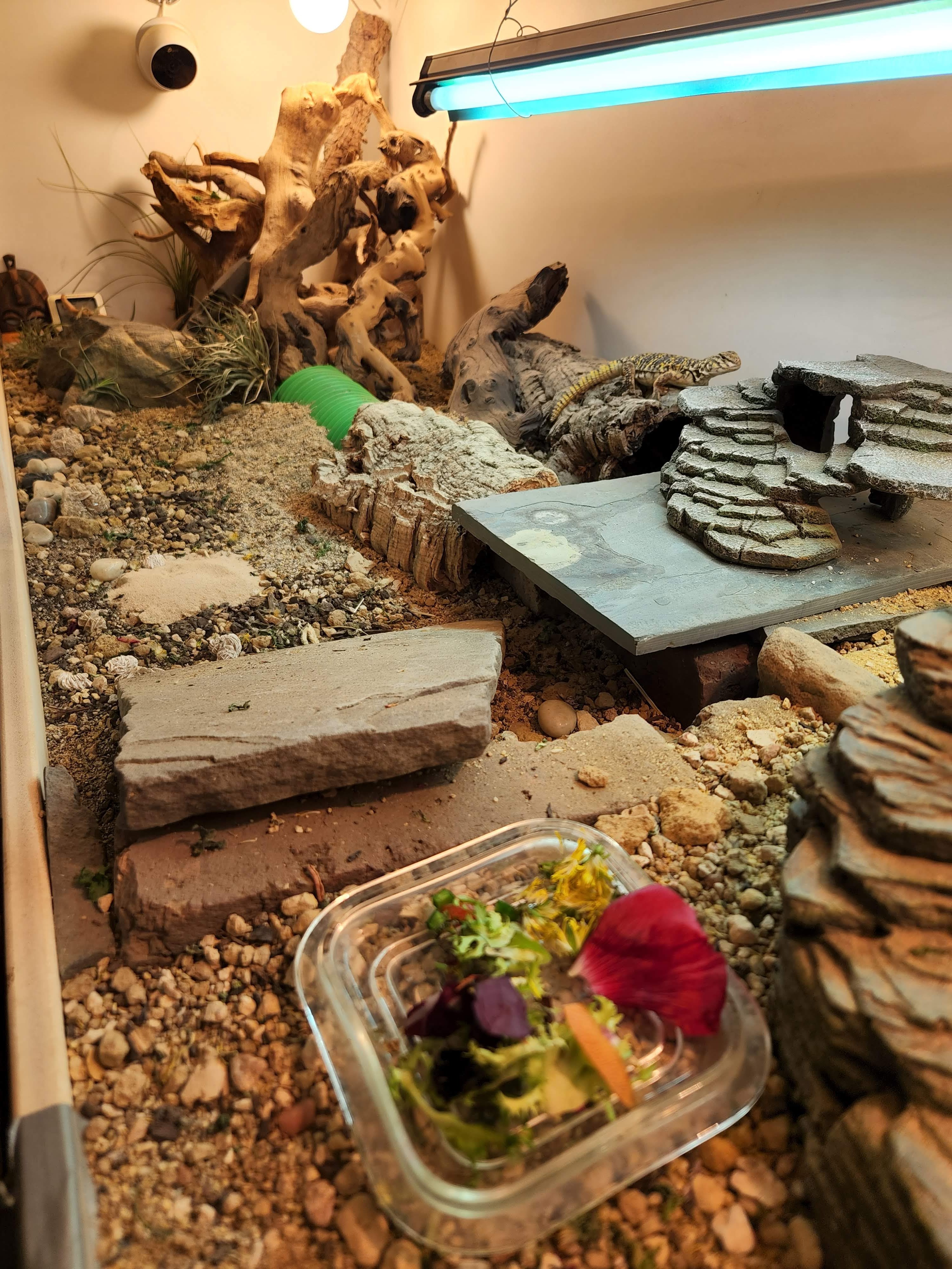 She has her own little desert with the right temps, lots of room to run and explore, and dead trees to climb. From up high she has a vantage point, and she also finds treats up in the trees when she goes foraging, the way the uros have to do to find food in the desert. She has a big mountain cave to hide in at night, and the top offers several different choices of heat gradient so she can choose which temp to bask at. In the other end is her oasis, where some real plants live and the dead trees provide all kinds of adventures.