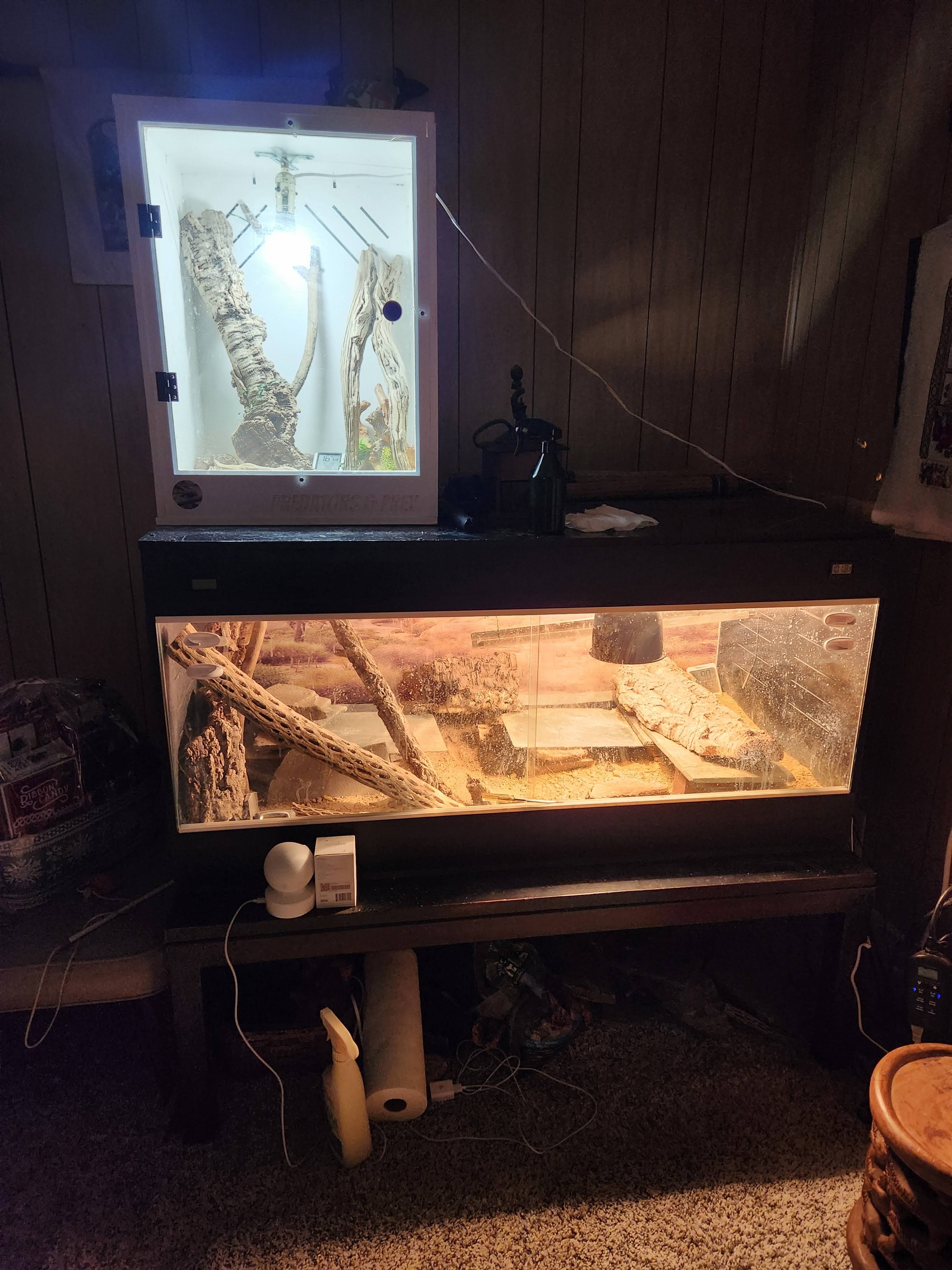 Well yes, give me a week or so to figure out a temporary enclosure for him til I can get the right one. So I rigged up a good UV tube and heat lights in a small enclosure I had, and ordered one big enough for an almost full grown redback chuckwalla.