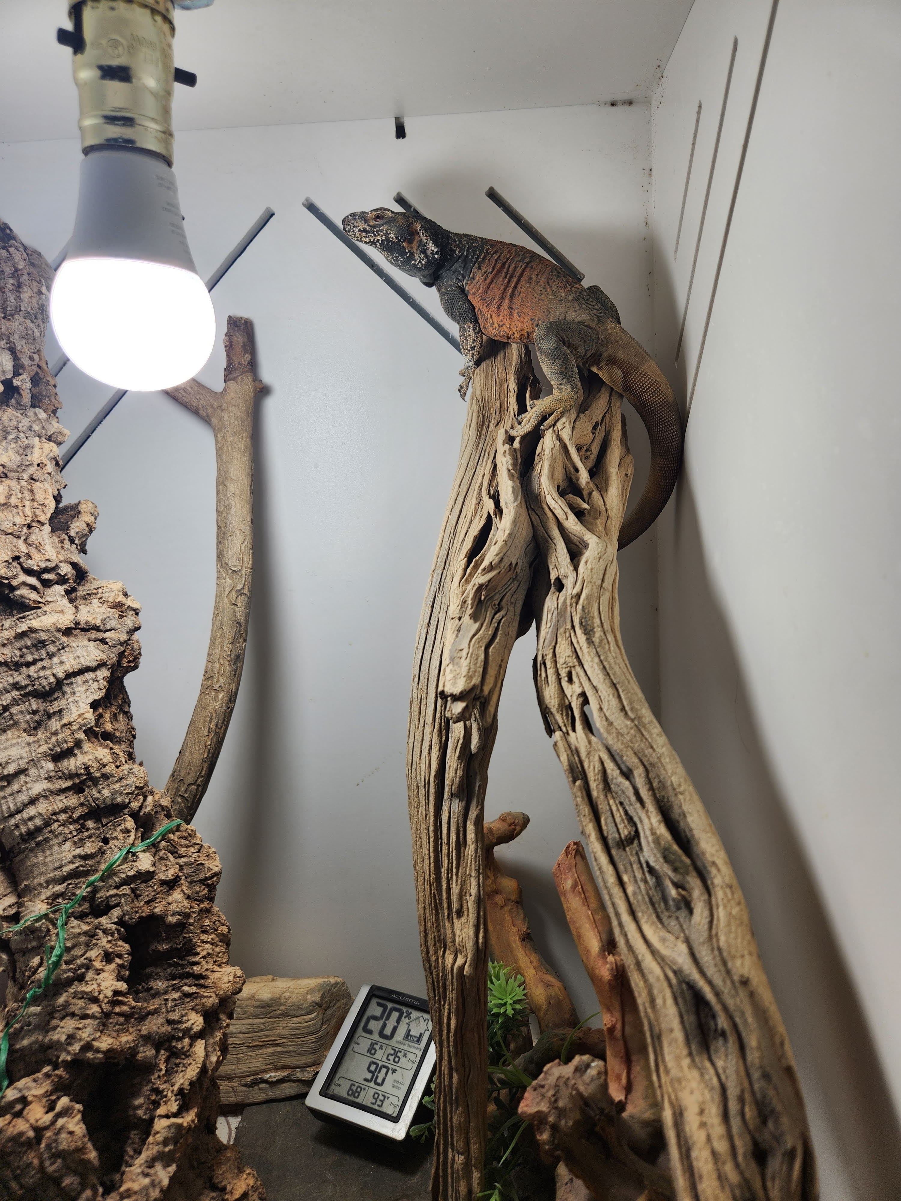 He’s a happy chuckwalla. He likes his house and his food, his temperatures and light schedule. He’s active, and up and down from top room to main enclosure all day. Climbs up long sticks to get up there, and to go down, he puts himself in the hole in the floor and throws himself down on to the rocks below. These are the same kinds of activities a chuck in the natural habitats would do. Takes a little siesta in the afternoon like others do in our desert south west. He’s an acrobat and a character and I call him Chuckie Monkey.