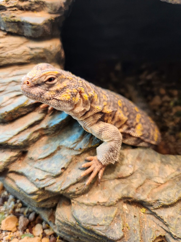 Not her individually, no. She was produced by a good breeder who handled his babies some before he sold them. But. Uromastyx in general are a nervous bunch. Predators kill/eat maybe as many as 50% of hatchlings in nature. Most of them never lose the instinct to be on guard constantly for snakes, bigger lizards and especially birds, from above. She is ok in her enclosure; she has had years to know it’s probably ok in there. (Right out of brumation she’s more wary: she hasn’t been looking around in her desert for a while. She hangs back in her cave a few days before she comes out.) You can see some confidence in the way she struts her cute little self around. 🙂 But when I get her out she gets scared, and goes back in her house and hides for the rest of the day. So the only time I get her out and take her away from her house is to weigh her, every couple months, and I make it quick. I do pick her up and handle her for a couple minutes each day, to maintain trust. But I handle her in her house or right in the doorway so she still feels safe. And hand feed her some treats every day. Way different than a beardie.