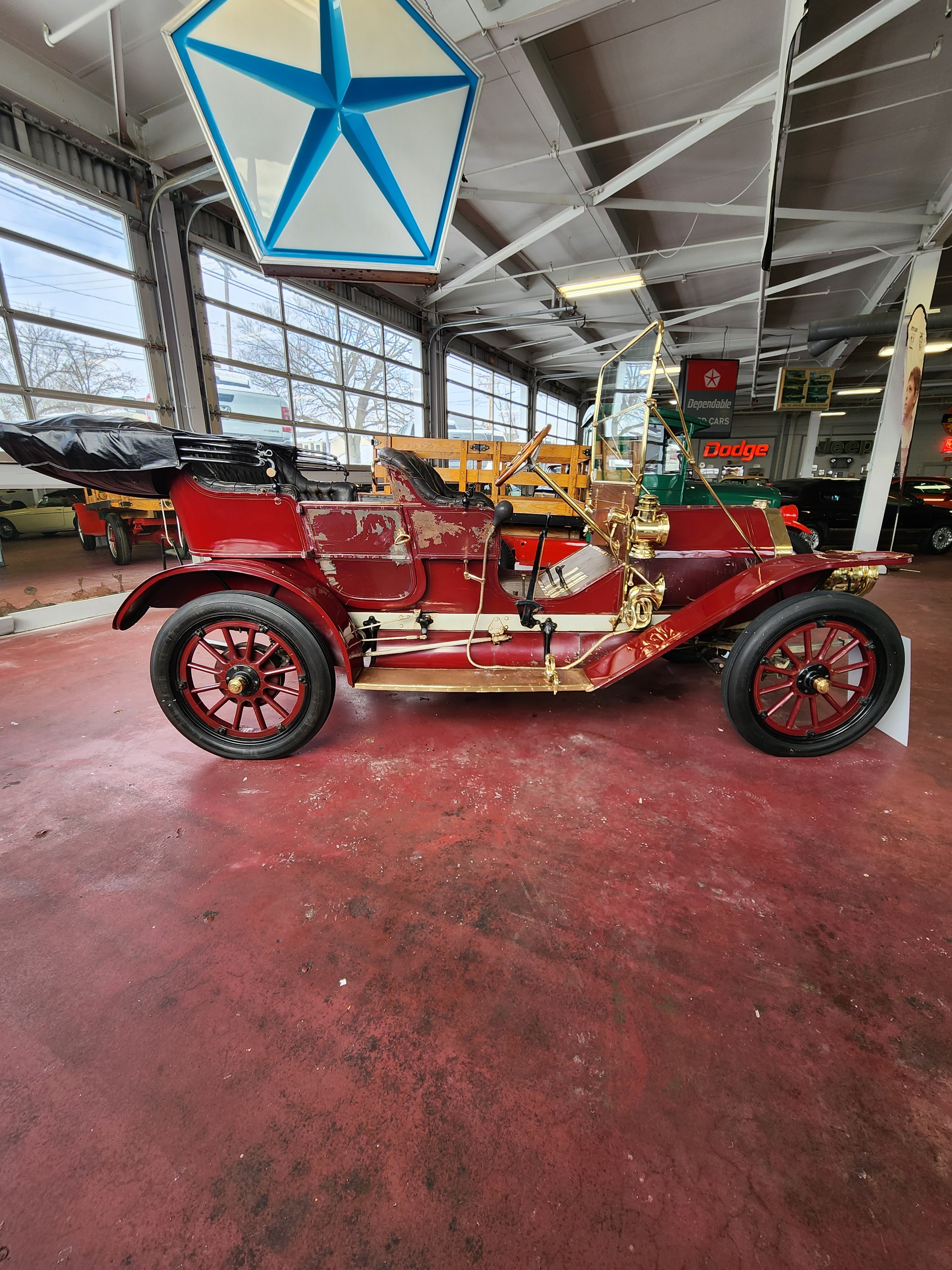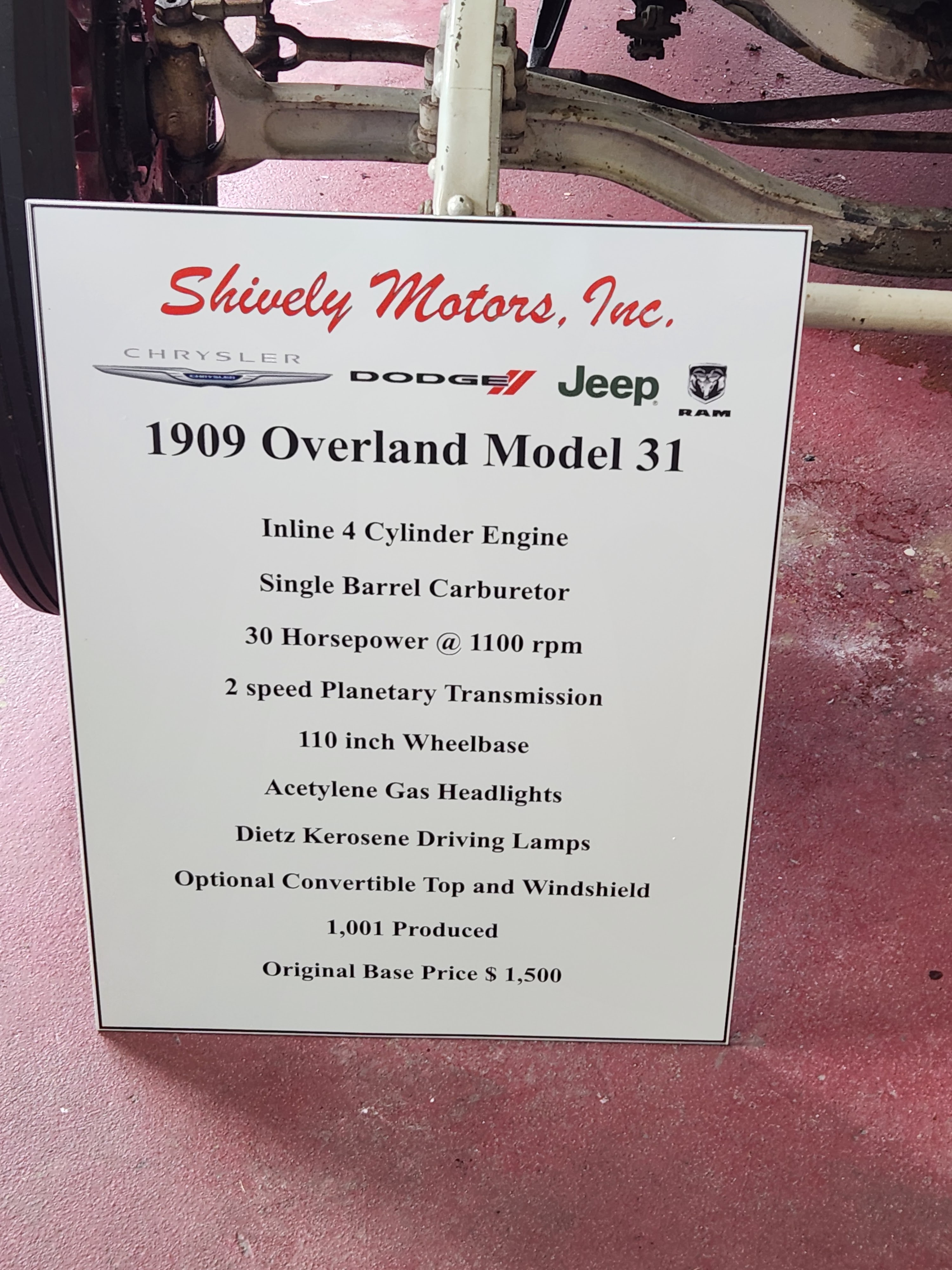 We asked Shively Motors General Manager Bryan Burkholder if they would want to display our car in their Mopar museum. The car is an Overland, which later became Willys/Jeep so it fits right in their museum. He wanted to display it, so his staff picked the car up and took it to the museum. Then they shined it up like it hasn’t shined for years when we had it in storage. Some of the paint is flaking off and some of the leather is showing wear. But they cleaned everything to make it look good and the brass fixtures look like new. This car was an expensive item in its time.