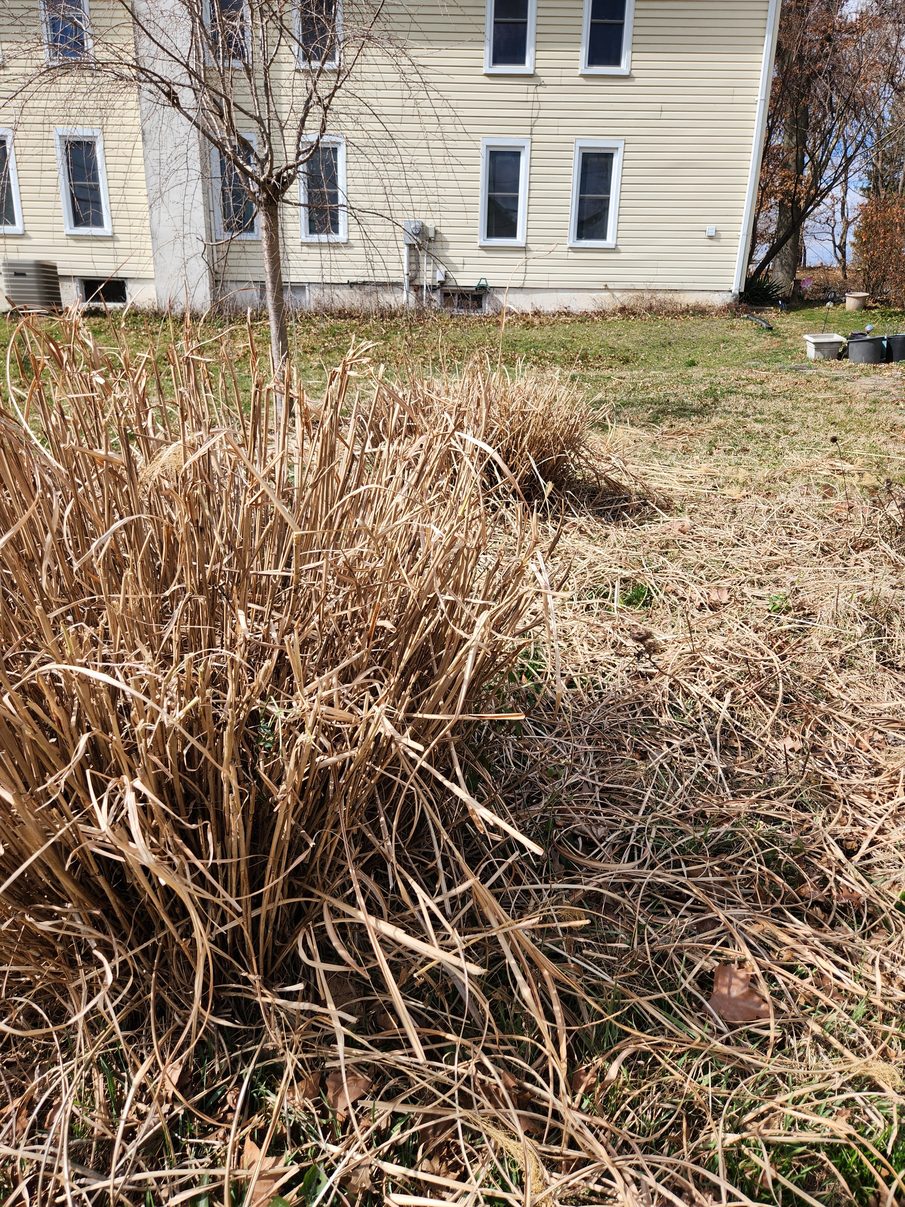 There’s a lot of cleanup work in the yard in the spring, before it’s time to grow things. Winter is a rough season here. I let this pretty pampas grass stand thru the winter and it lays down in the snow, but stands back up then in all but the worst storms. In the spring, before new growth starts, I break it off, so it can start over.
